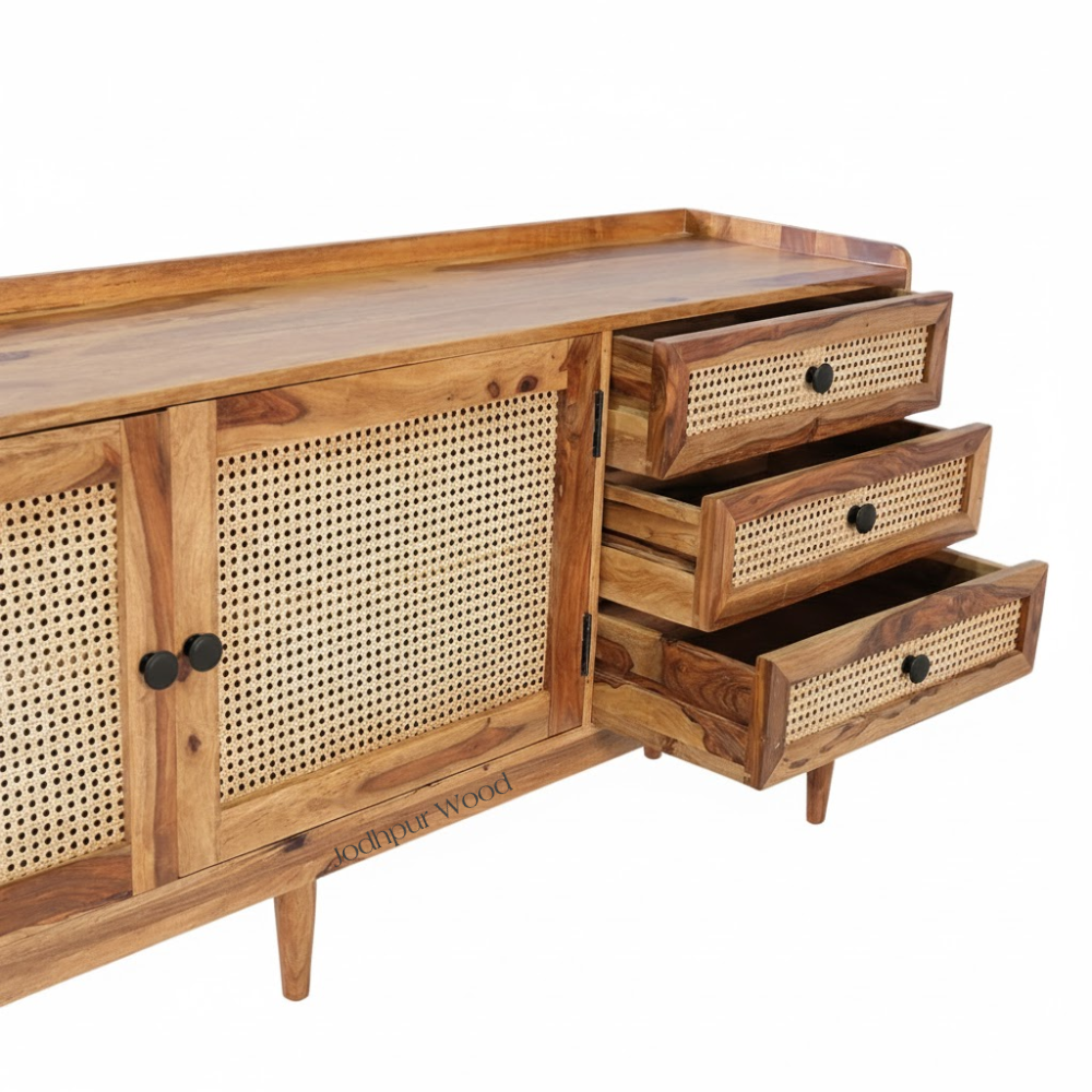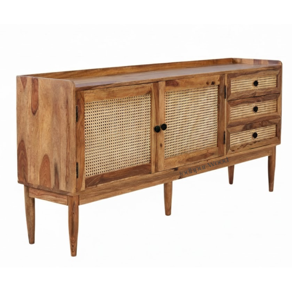 Introduce timeless craftsmanship into your home with the CaneCraft Sideboard in Sheesham Wood. Expertly handcrafted from premium solid Sheesham wood, this sideboard showcases exquisite woven cane detailing on its doors, bringing together rustic charm and modern minimalism.