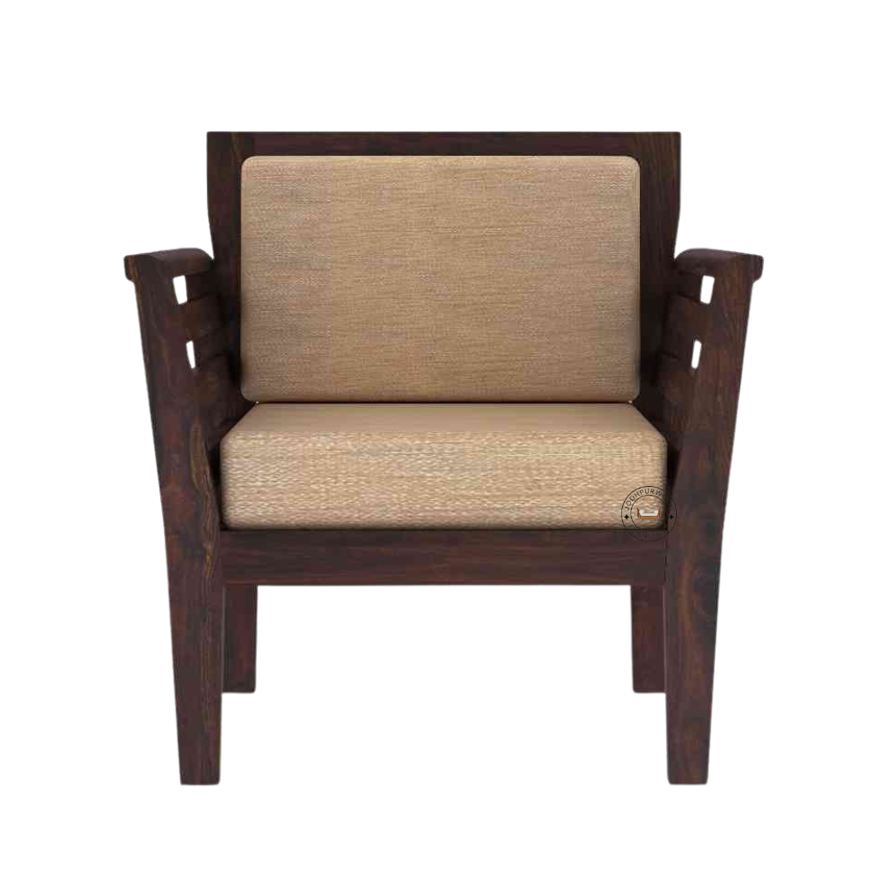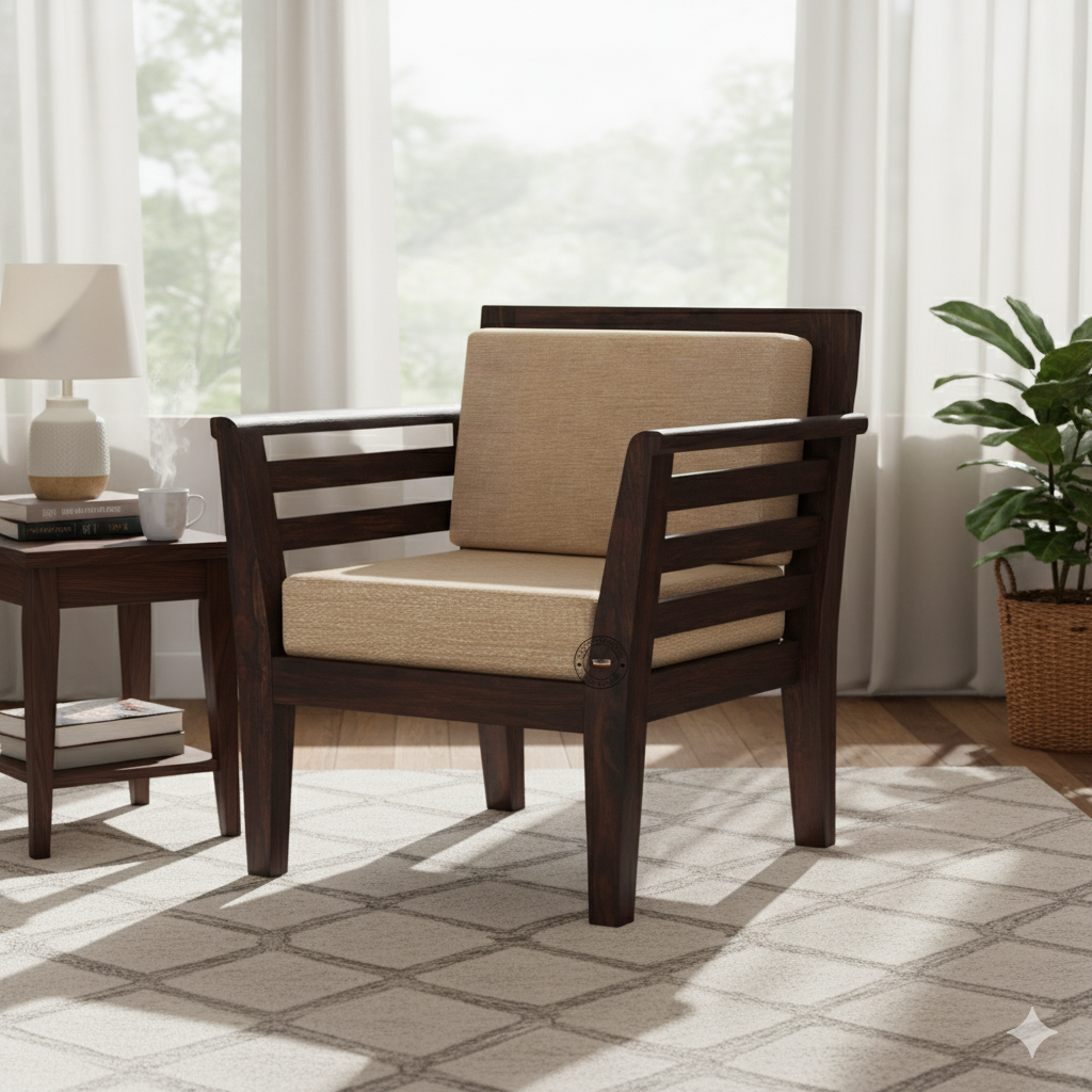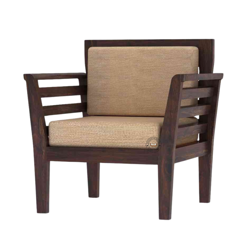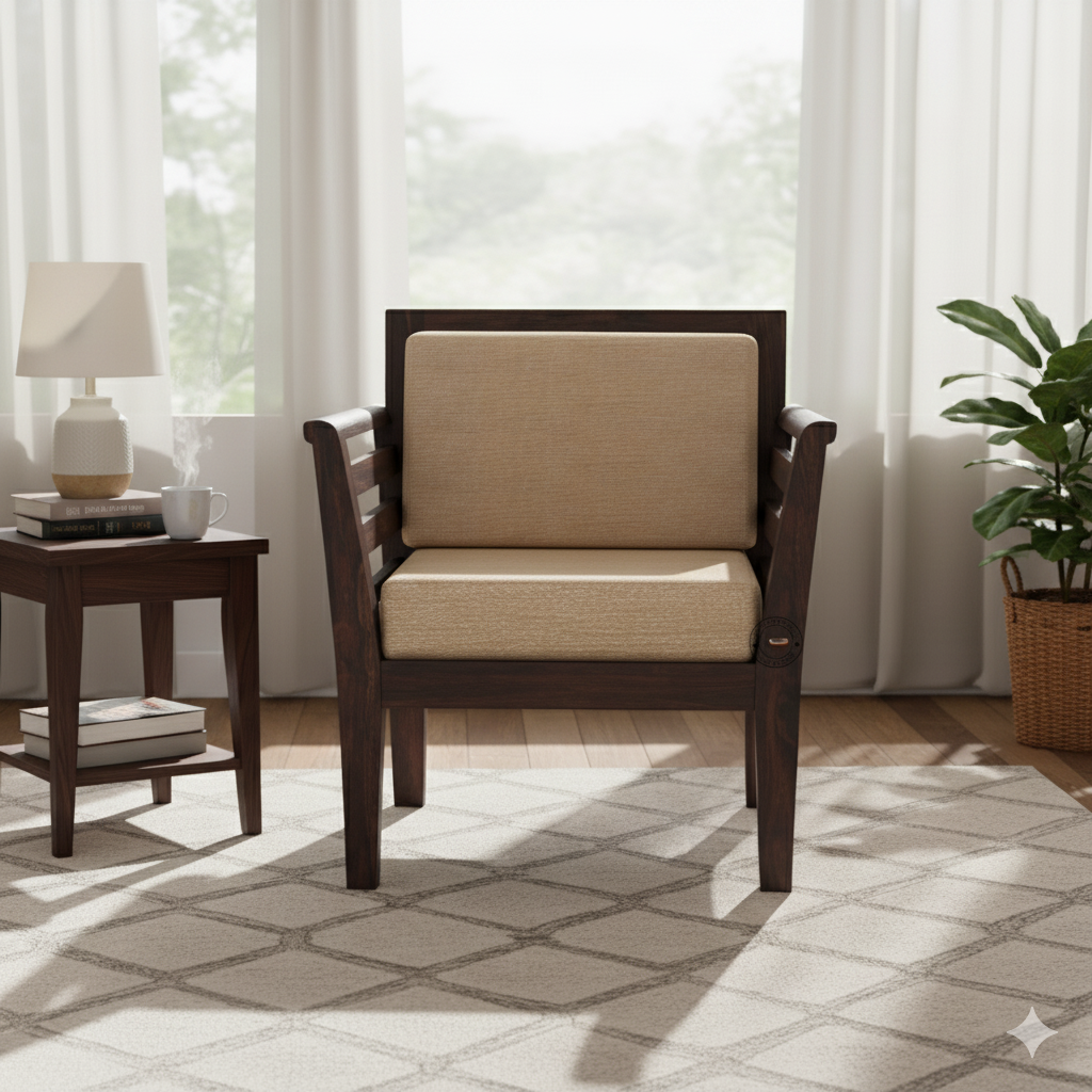 Expertly handcrafted from premium-quality solid Sheesham wood, this single-seater sofa showcases Jodhpur’s traditional artistry combined with a modern design sensibility. The natural wood grains, rich finish, and smooth polish highlight the sofa’s royal character, while the soft upholstered cushions ensure supreme comfort for everyday use.