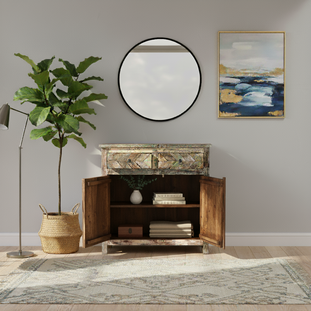 Designed with two spacious drawers and two shutter-style doors, the Elara Cabinet offers practical storage for your essentials — from dinnerware and linens to books and décor. The rustic hand-finished surface highlights the natural imperfections, grain, and tones of the reclaimed wood, adding warmth and personality to any room.