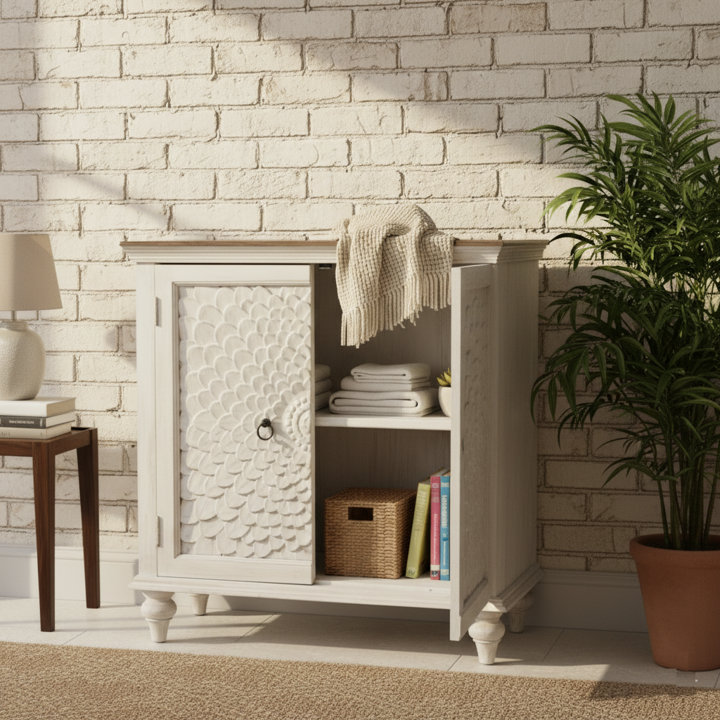 Bring home the Meera Handcarved Lotus Cabinet and infuse your space with the grace of traditional Indian craftsmanship and the charm of vintage artistry.