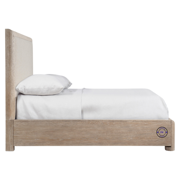 Side view of Neevi Panel King Bed showing upholstered headboard, low footboard, and Marcona wood finish