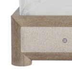 Close-up of Neevi Panel King Bed showing detailed upholstery on headboard and texture of Marcona wood finish
