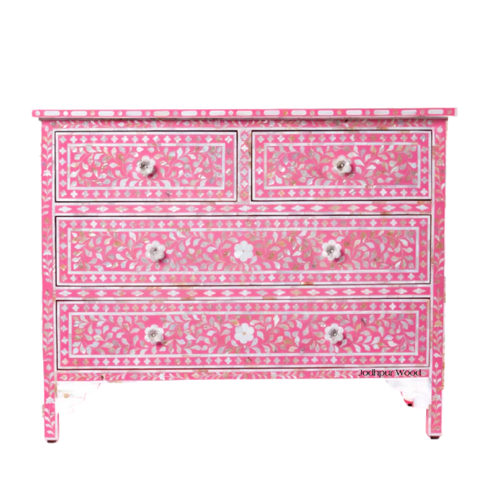 The soft pink finish enhances the delicate floral inlay, making this dresser a standout addition to any bedroom, living room, or dressing space. With four spacious drawers, it provides practical storage while serving as a luxurious décor element. Its handcrafted detailing and exquisite design make it an ideal piece for those who value heritage décor and modern styling.