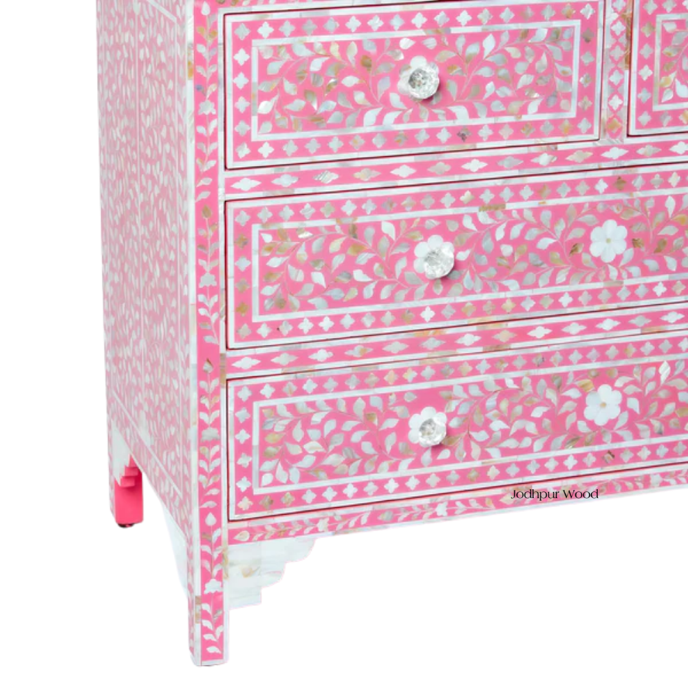 Experience the charm of handcrafted Indian artistry with the PinkAura Bone Inlay Dresser, beautifully crafted on sturdy Jodhpur wood and adorned with detailed floral bone inlay patterns. Each element of this dresser reflects the cultural richness and skilled craftsmanship found in traditional Jodhpuri Furniture, where artisans from Rajasthan bring generations of expertise into every piece.