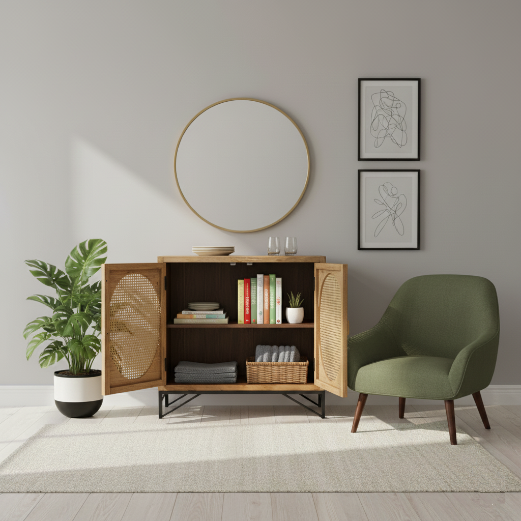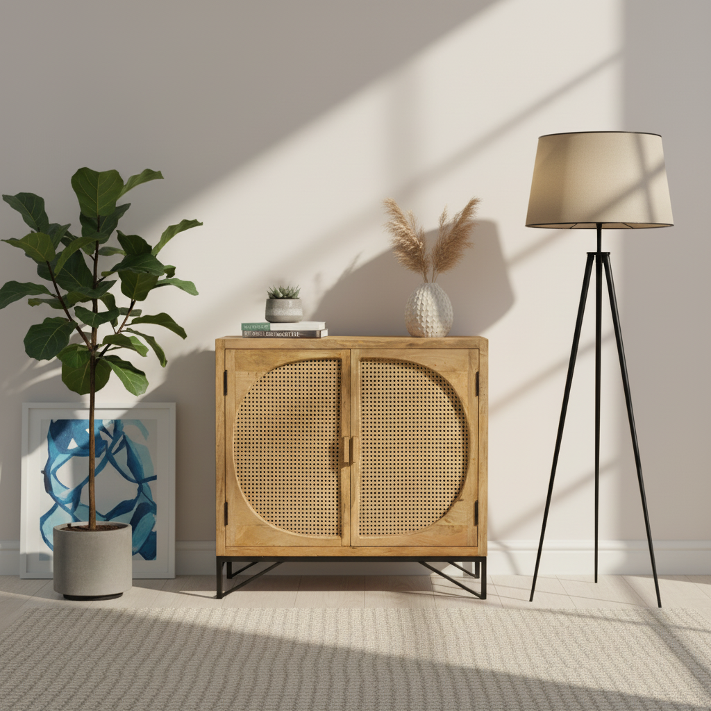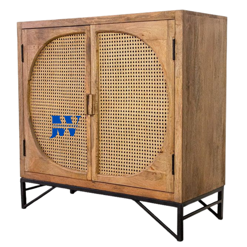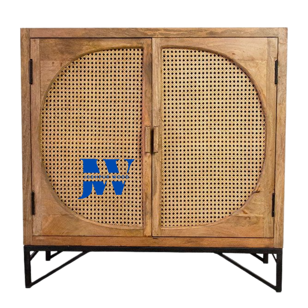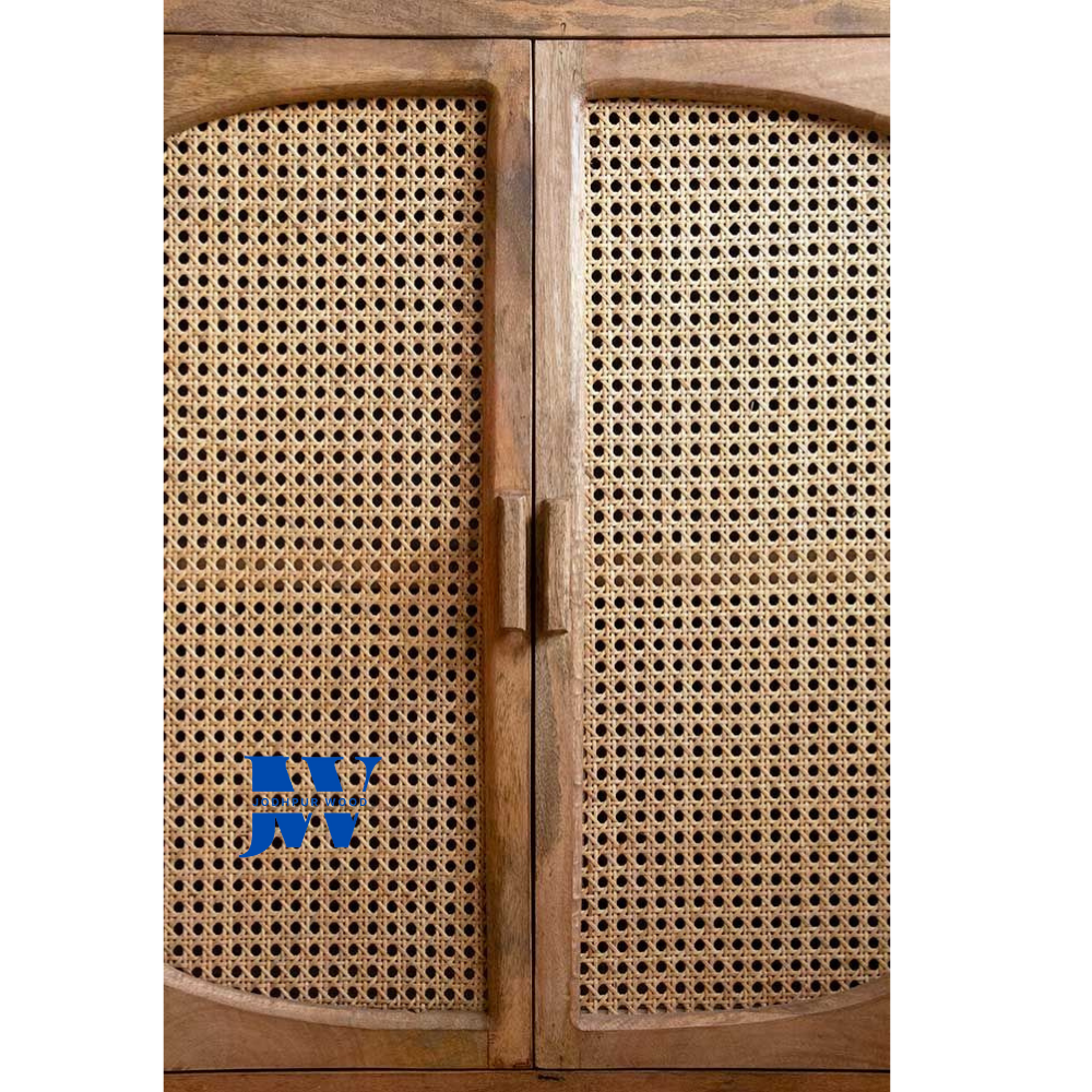 Expertly made by skilled artisans, this beautiful cabinet combines solid wood strength with natural cane artistry, creating a perfect balance of durability and elegance. The two-door design features intricately handwoven cane panels that bring warmth, ventilation, and texture to your décor.