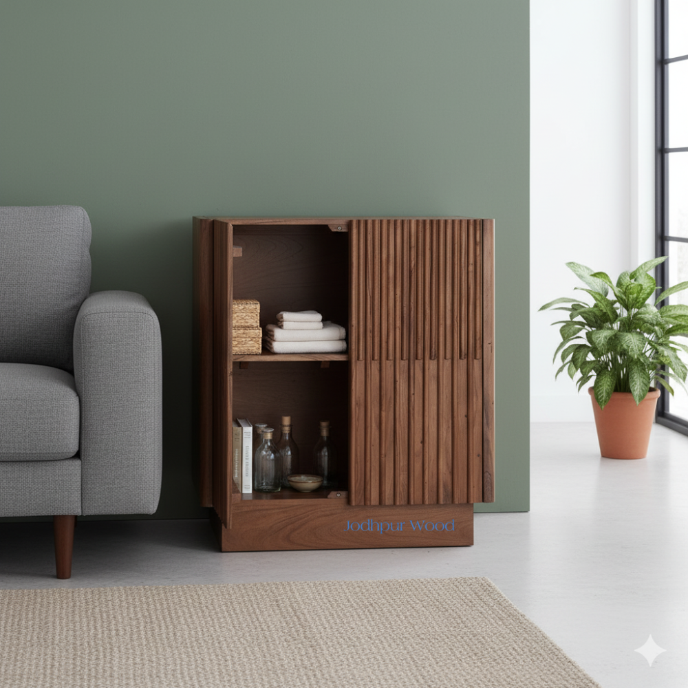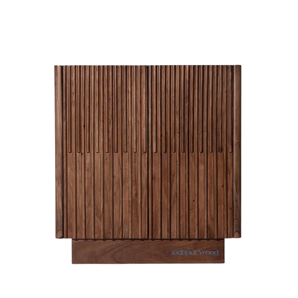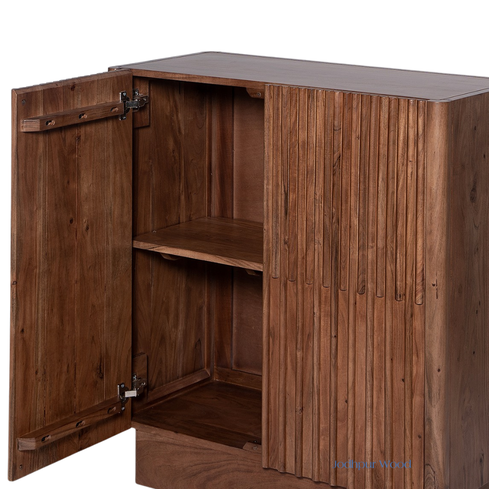 Known for its rich texture and natural grain pattern, acacia wood gives this cabinet a stunning organic charm and long-lasting durability. The two designer doors feature elegant detailing that enhances the cabinet’s modern aesthetic while preserving its handcrafted essence.