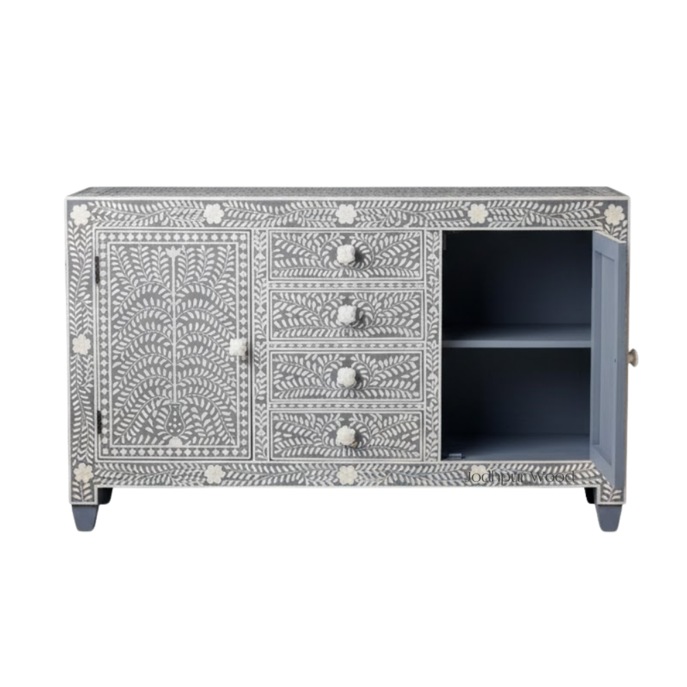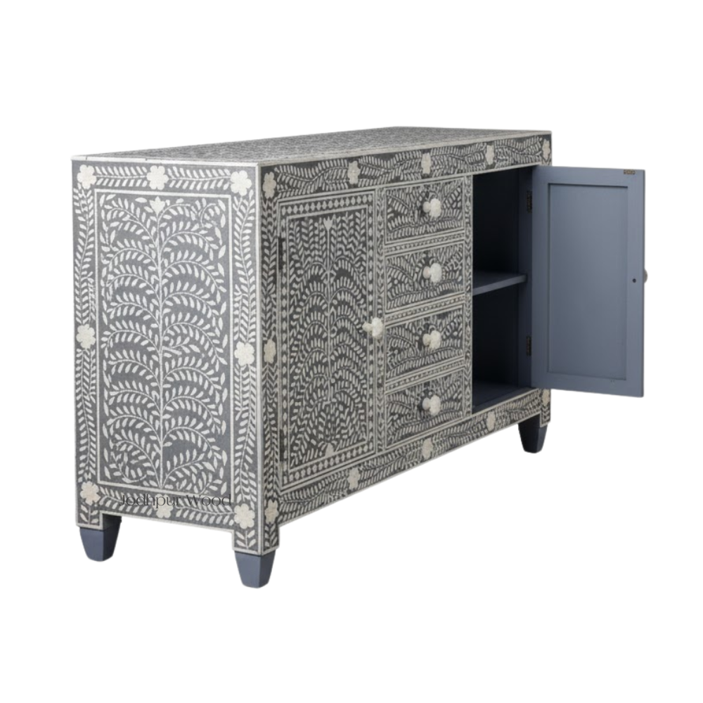 Handcrafted by skilled artisans in Jodhpur, Rajasthan, this sideboard features two spacious doors and four drawers, providing versatile storage while showcasing stunning floral bone inlay artistry.