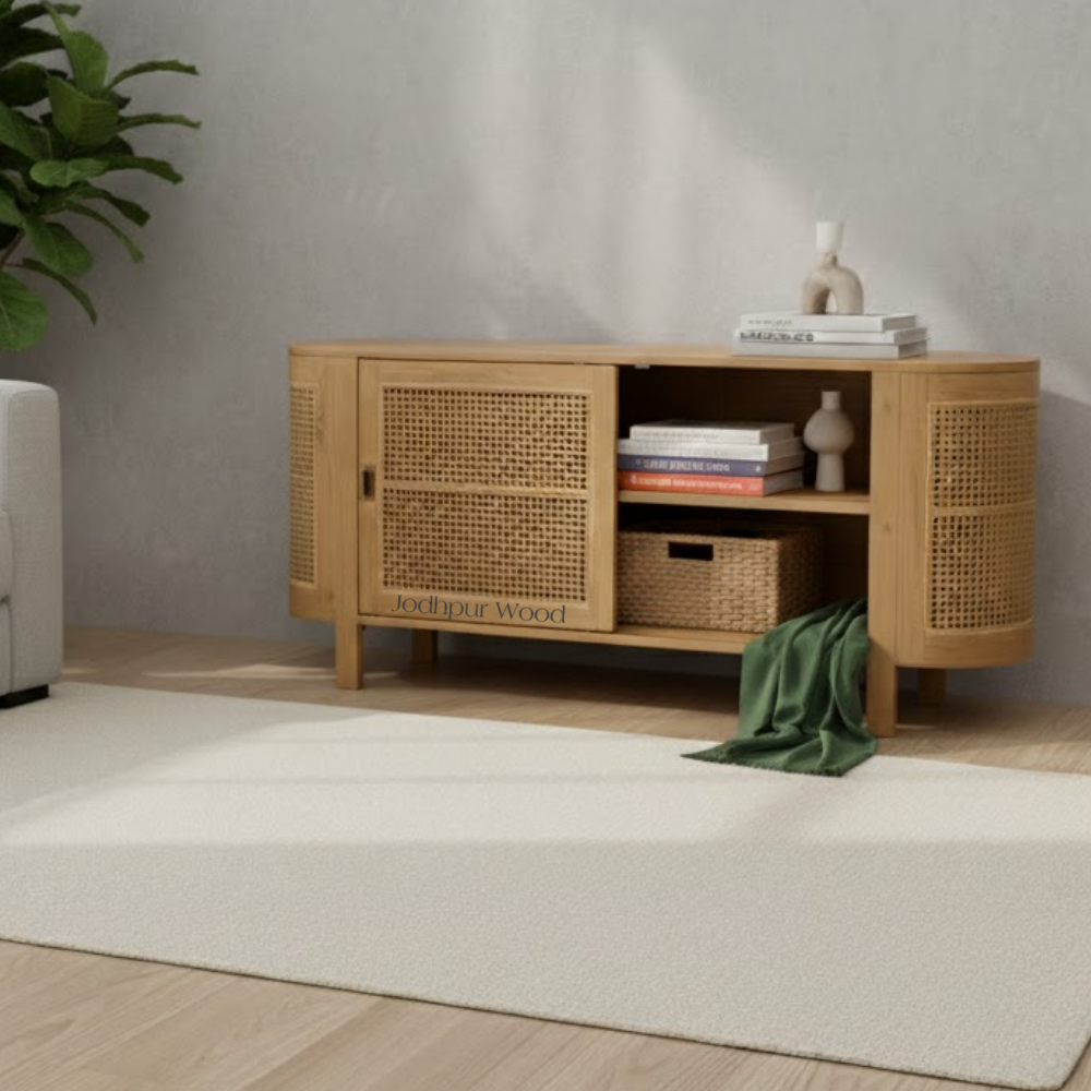 Handcrafted from premium teak wood, this sideboard features two spacious doors fitted with natural handwoven cane panels, adding texture, warmth, and a relaxed sophistication to your space.